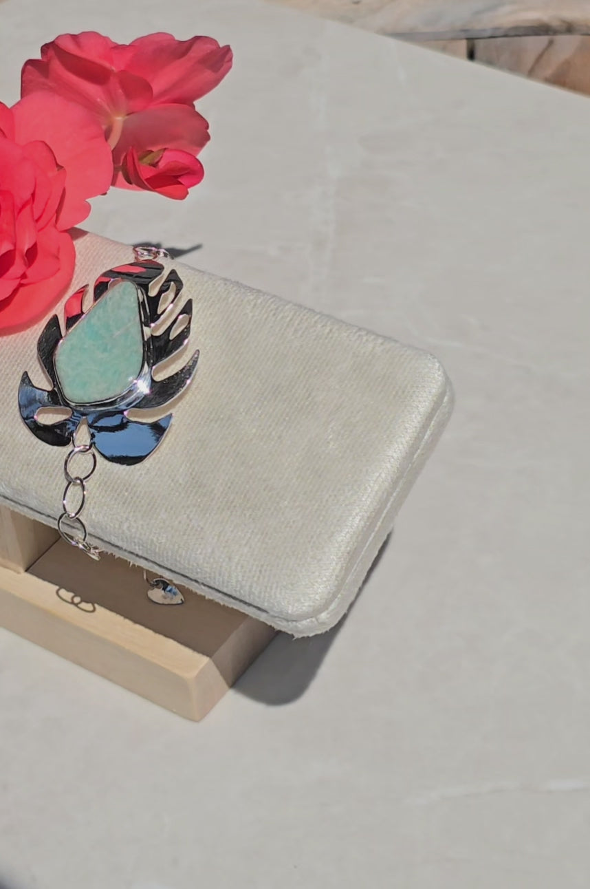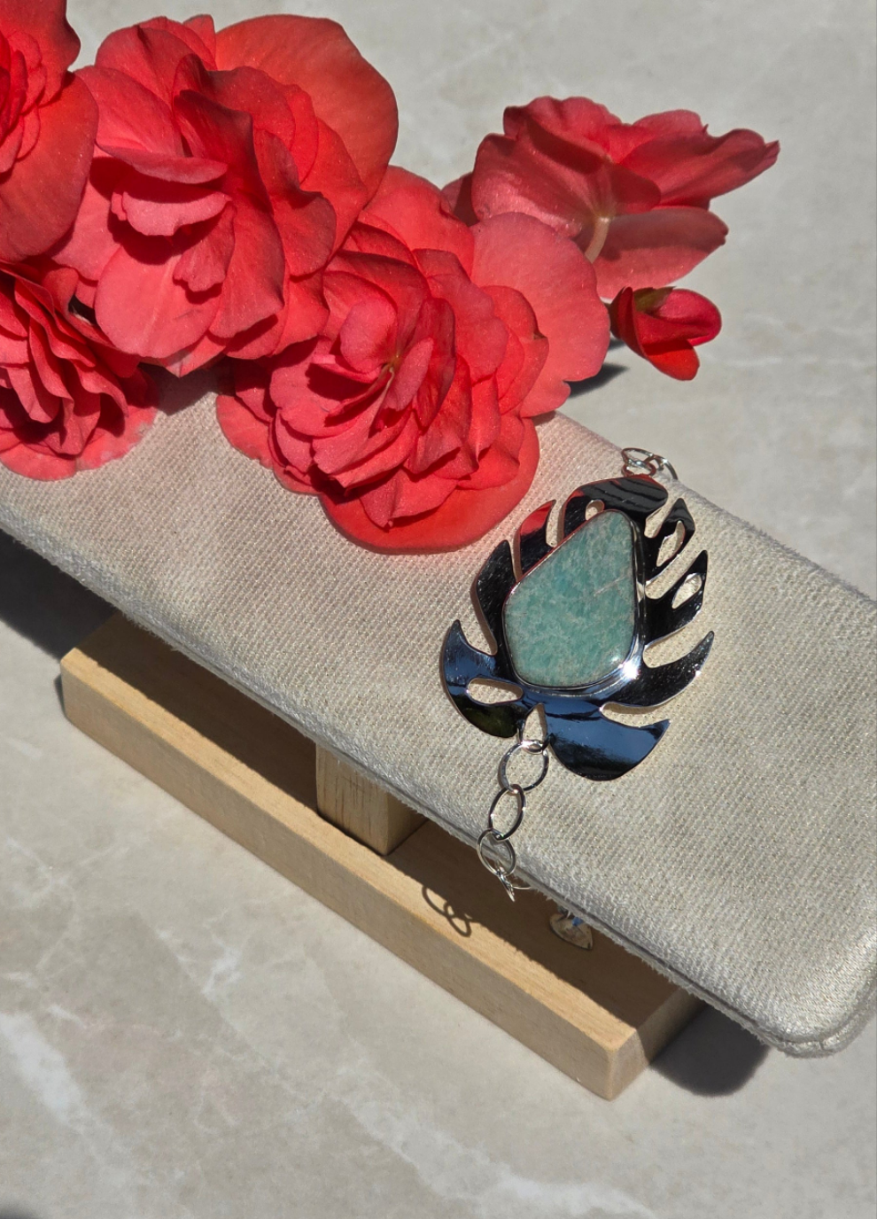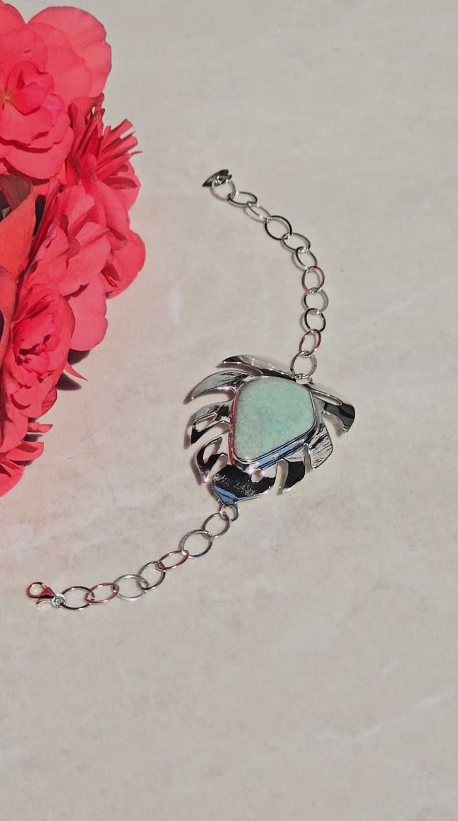 This bracelet is handcrafted in solid .925 sterling silver and features slightly oversized chain links for a bold yet elegant look. At the center lies a cutout Monstera leaf — a symbol of growth and vitality — with a bezel-set Amazonite stone nestled in its heart. The combination of organic shapes and solid silver gives the piece a vibrant yet grounded presence.