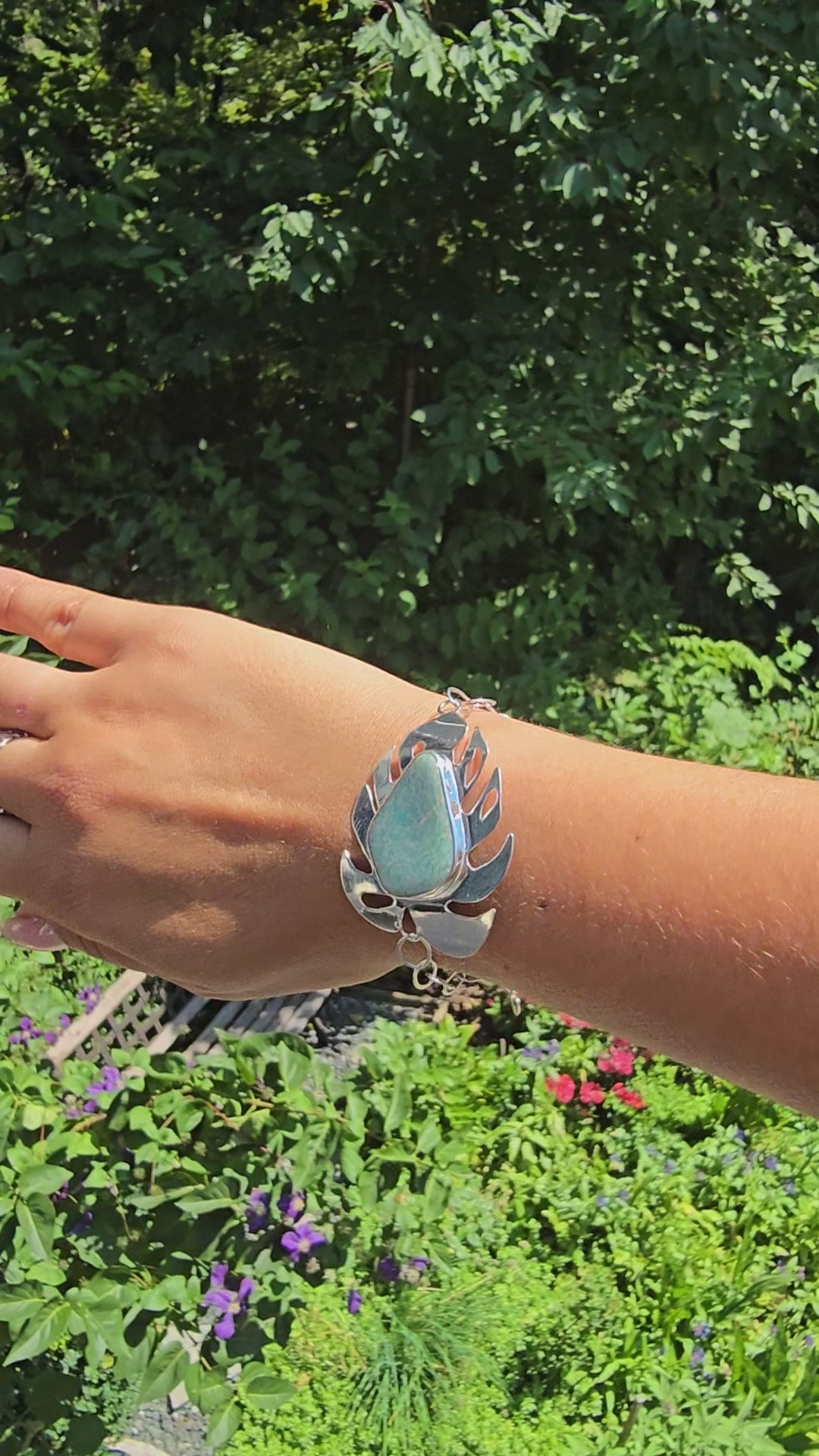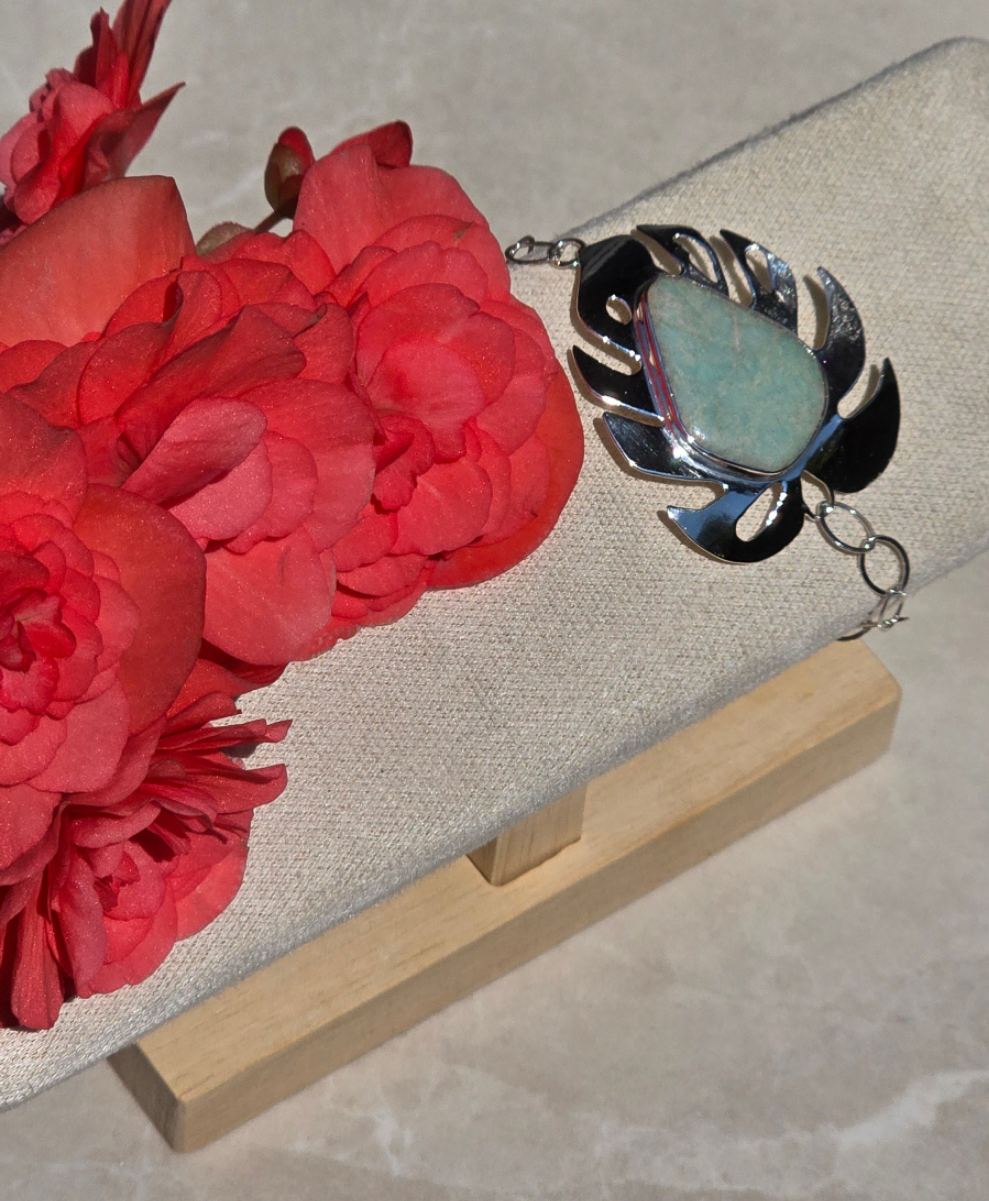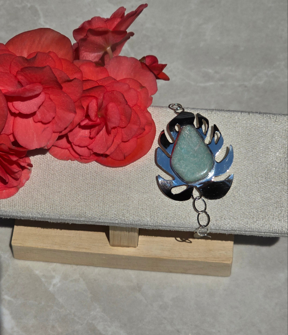This bracelet is handcrafted in solid .925 sterling silver and features slightly oversized chain links for a bold yet elegant look. At the center lies a cutout Monstera leaf — a symbol of growth and vitality — with a bezel-set Amazonite stone nestled in its heart. The combination of organic shapes and solid silver gives the piece a vibrant yet grounded presence.