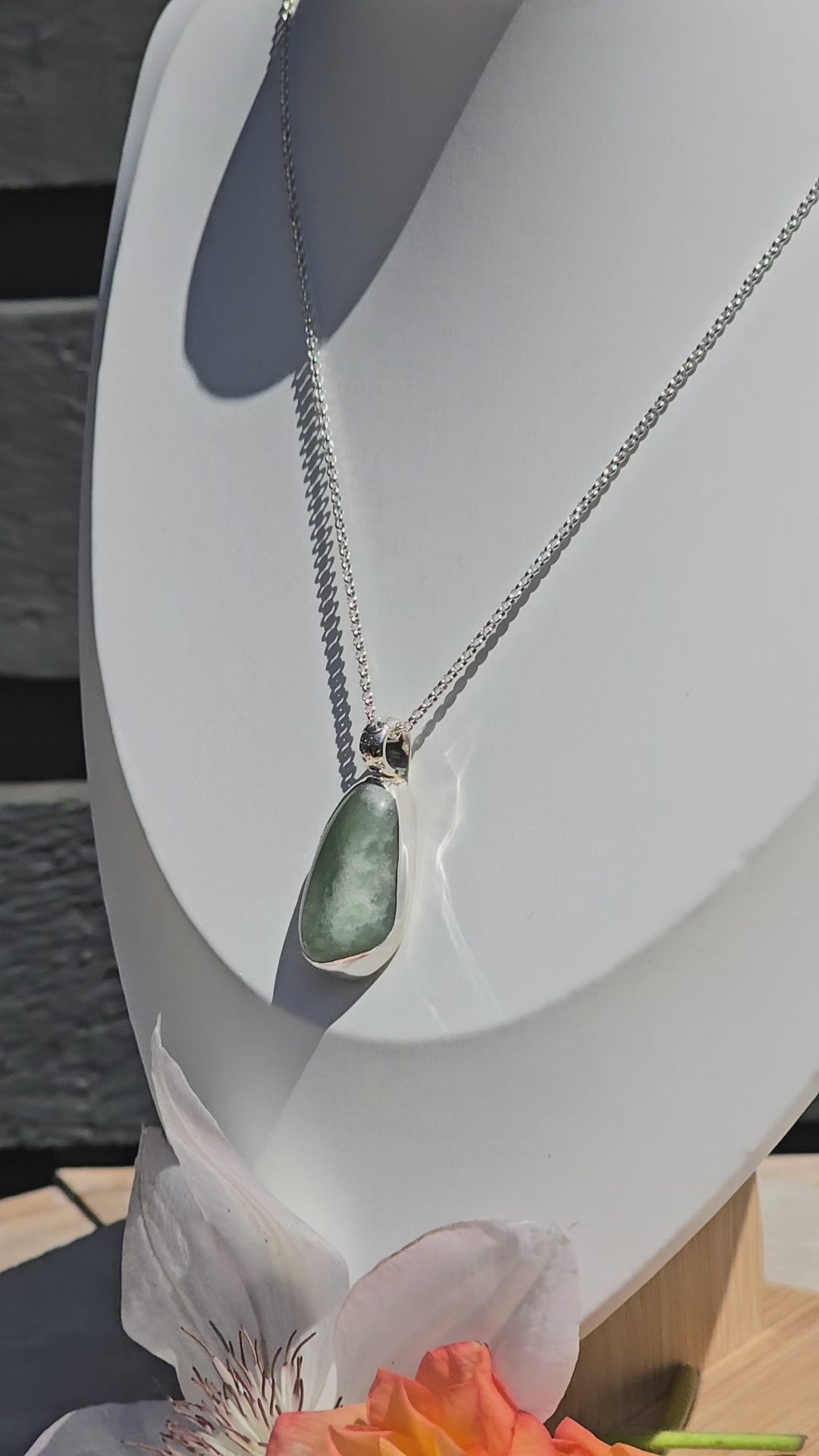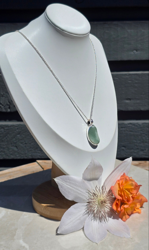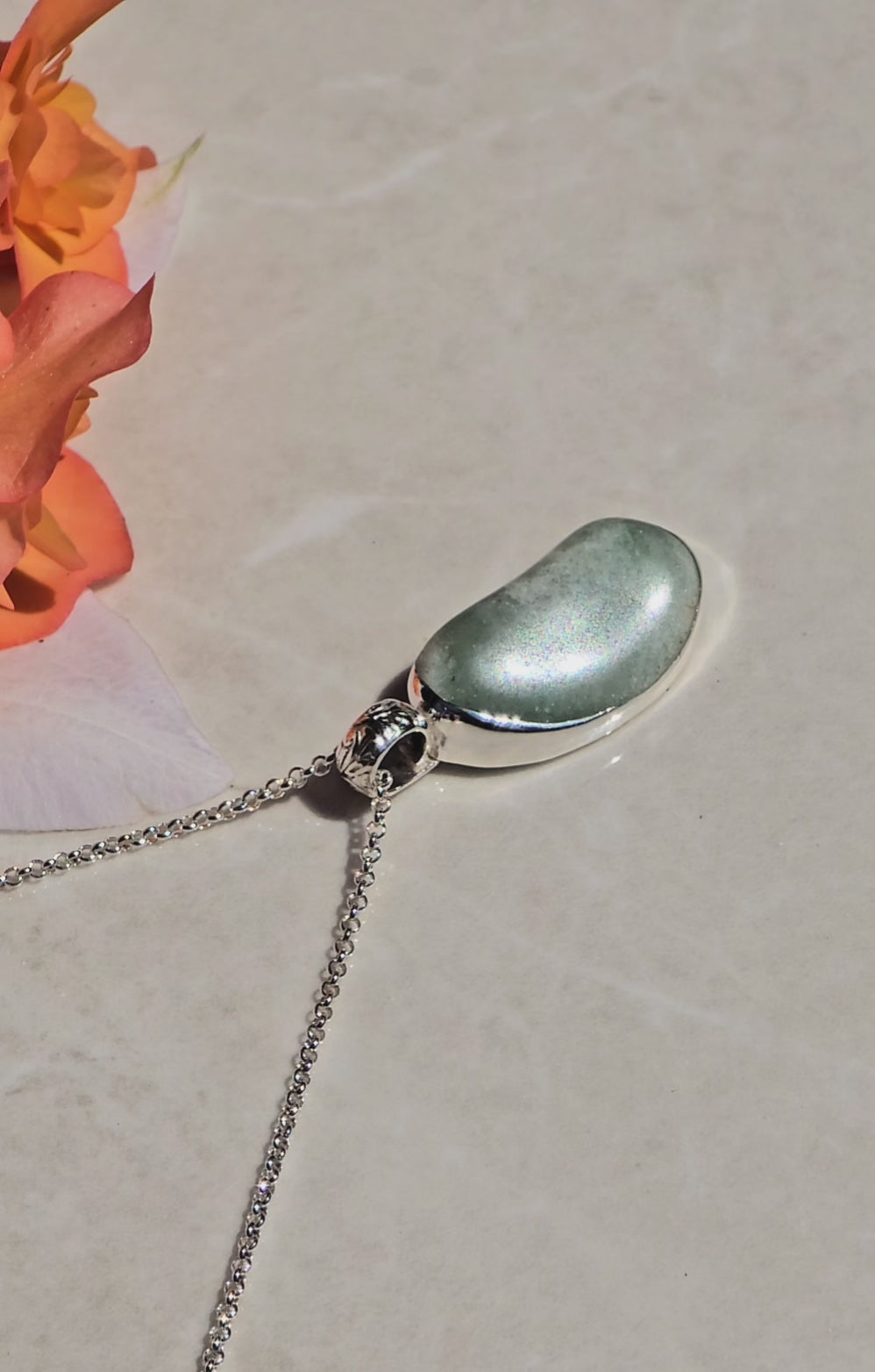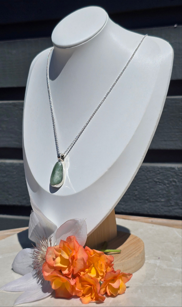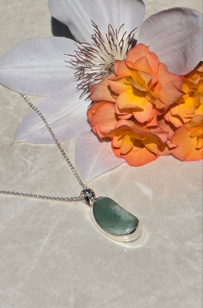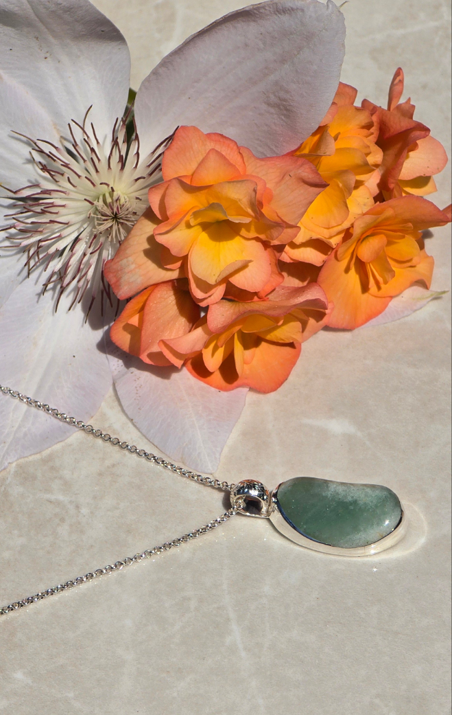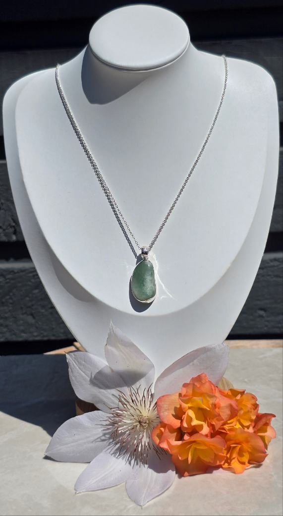 This necklace features a natural green aventurine stone, hand-selected for its soft shimmer and organic bean-like form. The stone is securely bezel-set in sterling silver with a smooth closed back. A beautifully detailed sterling silver bail—engraved with delicate vines and a tiny blooming flower—adds an extra layer of artistry and nature-inspired beauty. It hangs from a sterling silver chain that’s comfortable for everyday wear.