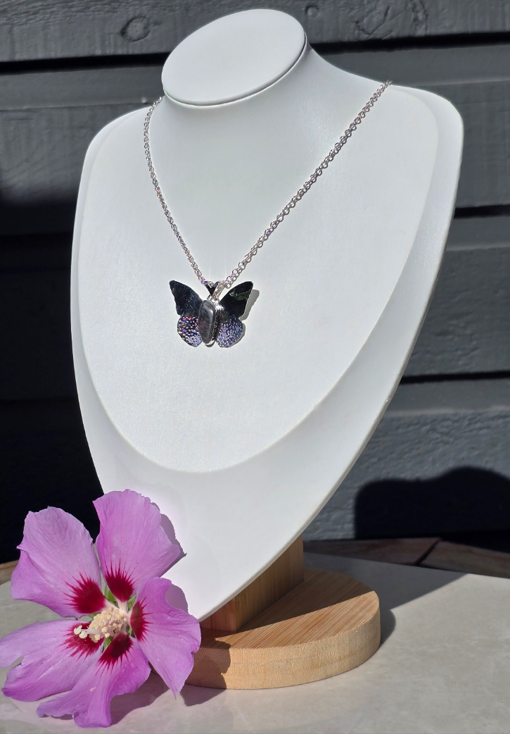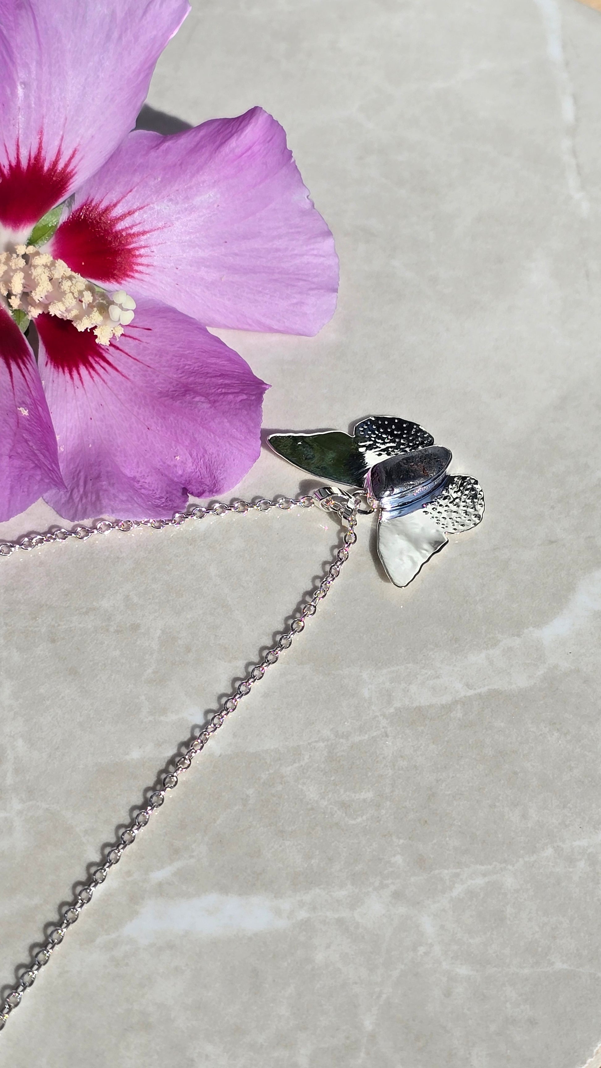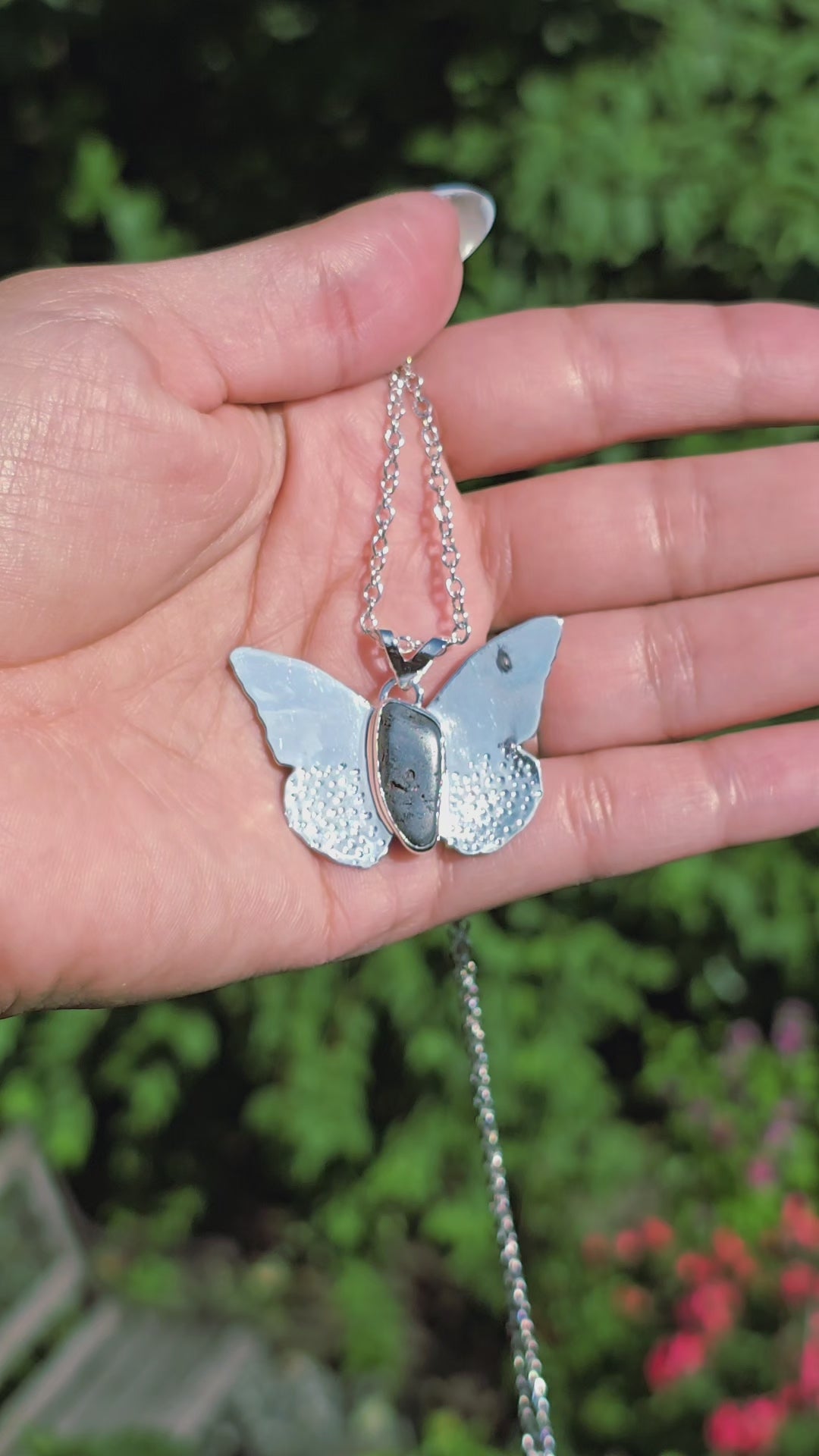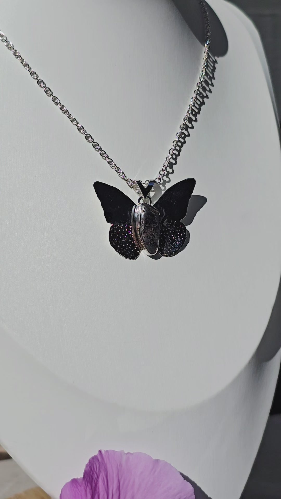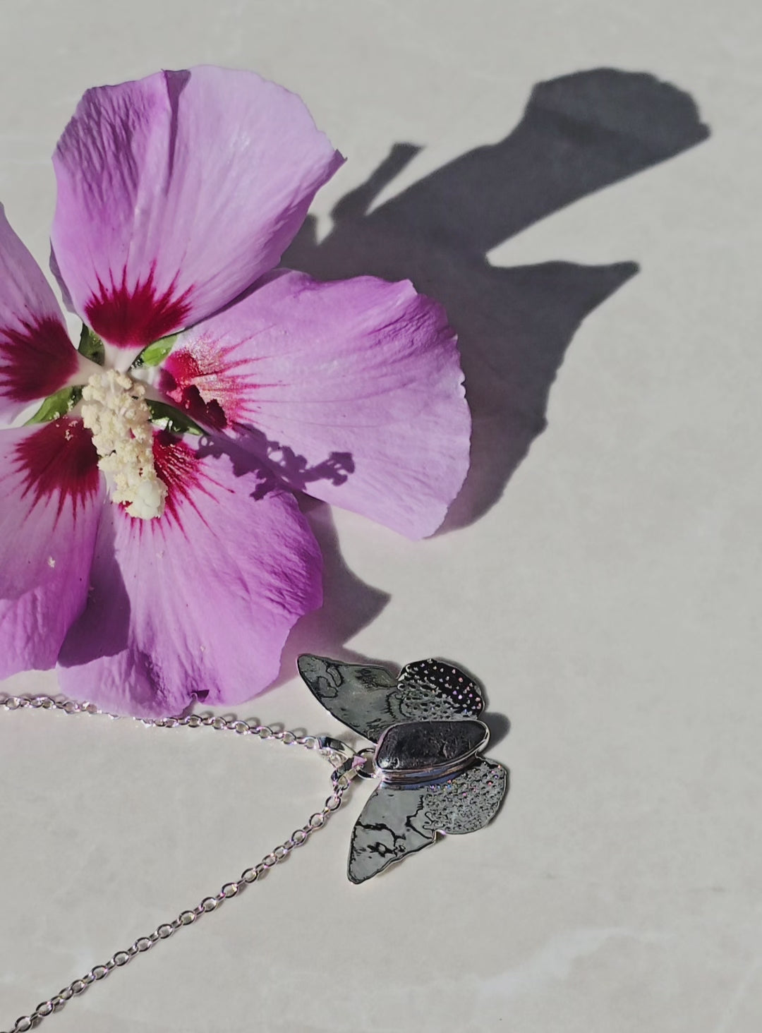 This necklace is crafted in sterling silver, featuring a graceful butterfly silhouette with polished detailing across the wings. At its center rests a natural Magnetite stone, its metallic-black surface displaying unique textures and subtle shimmer. Suspended from a sterling silver chain, this pendant offers a perfect balance of bold presence and refined artistry.