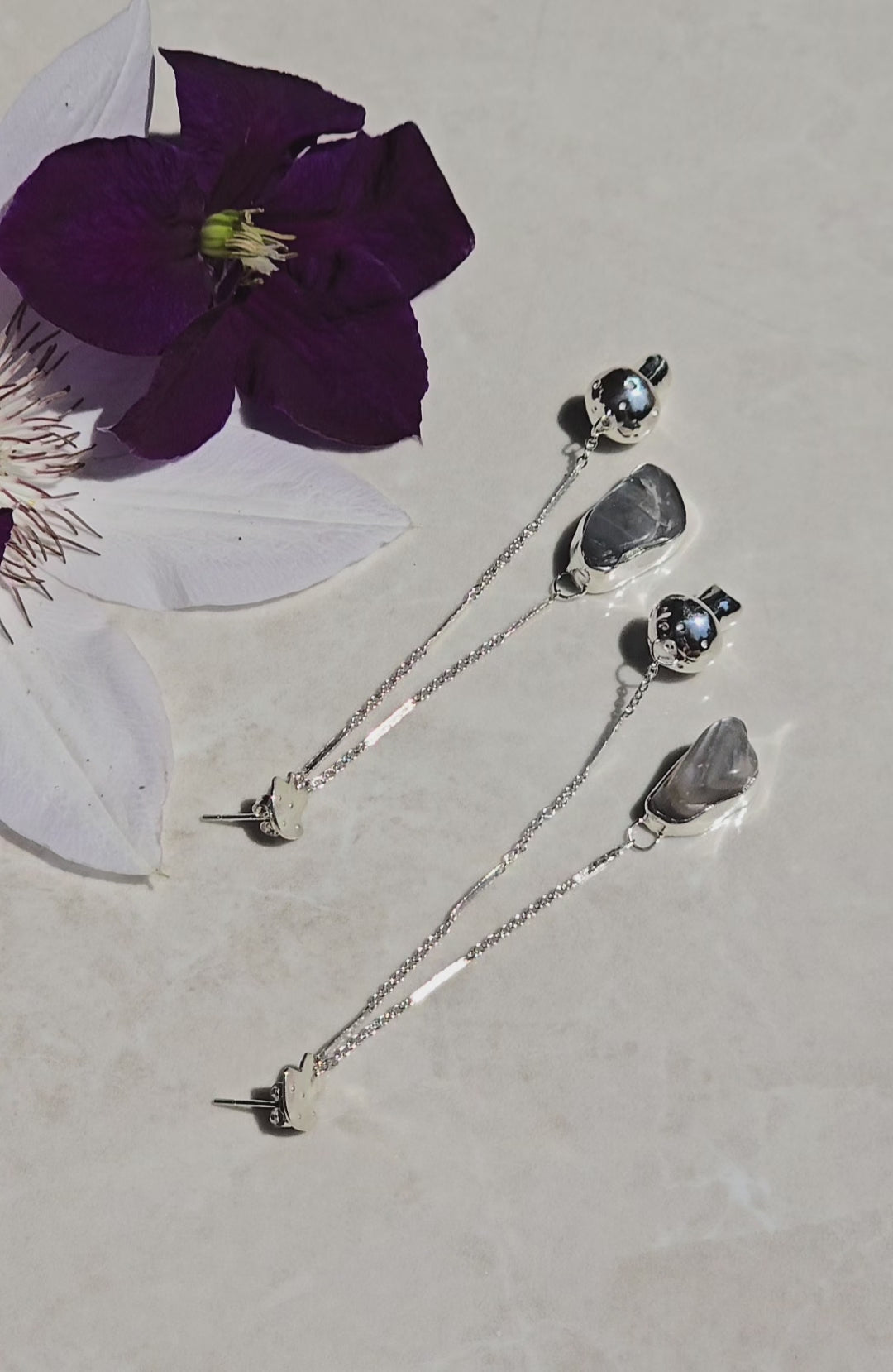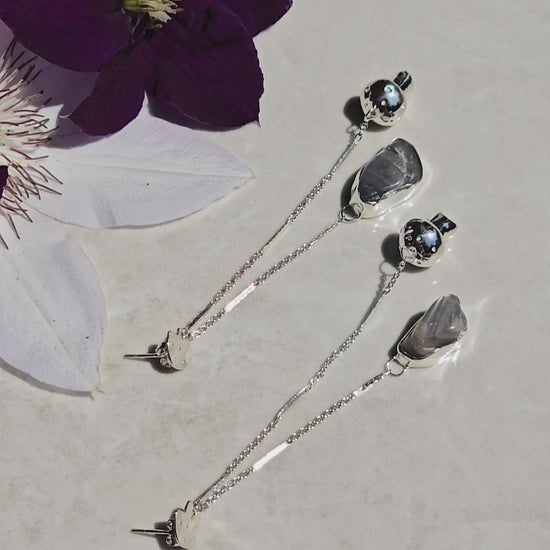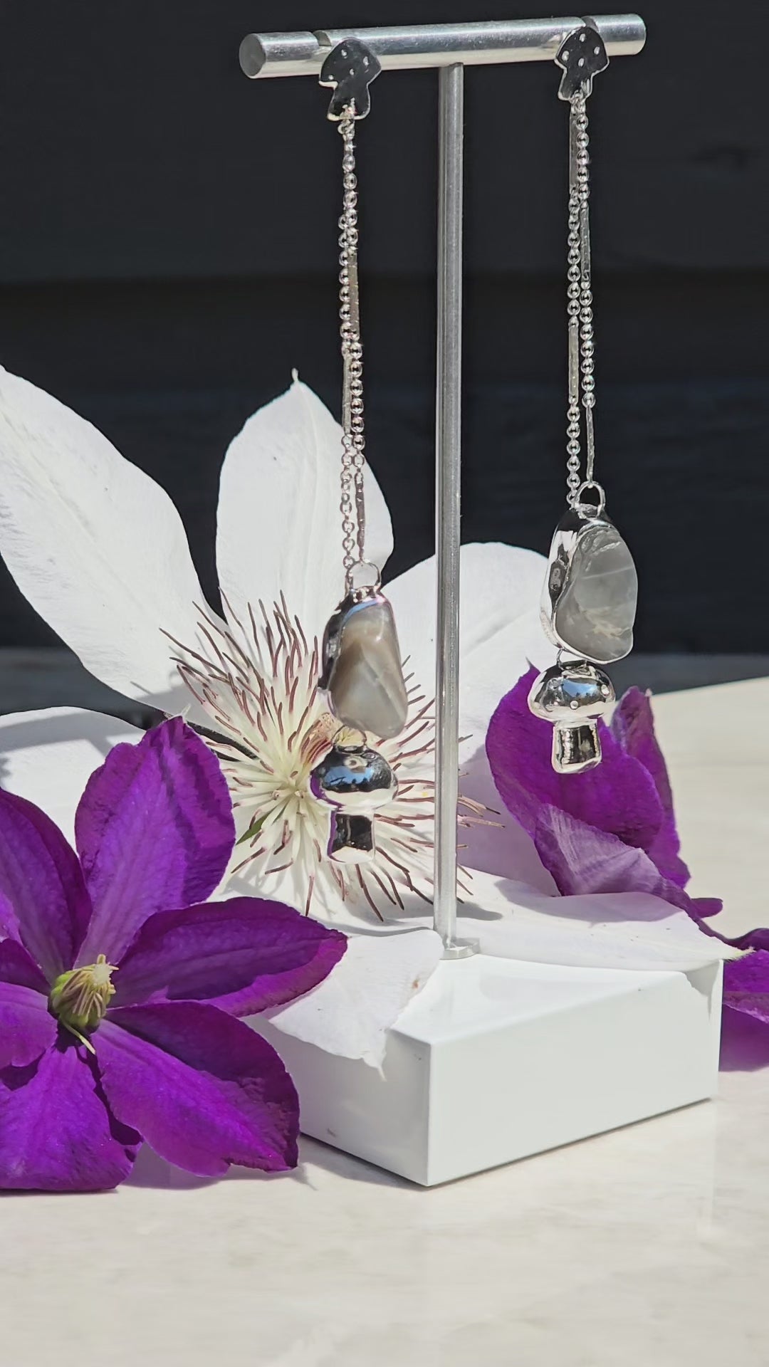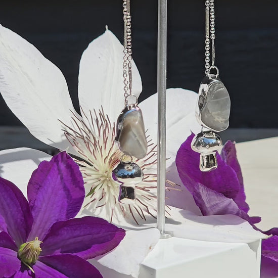 Each earring features a polished sterling silver mushroom stud with a delicate chain drop. One side holds a bezel-set Grey Moonstone, glowing with a soft, silvery sheen. The other features a hand-sandcasted sterling silver mushroom charm, giving the piece organic texture and a touch of forest magic. Lightweight and full of charm, these earrings are perfect for nature lovers, moon watchers, and dreamers alike.