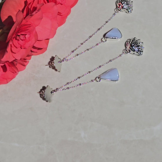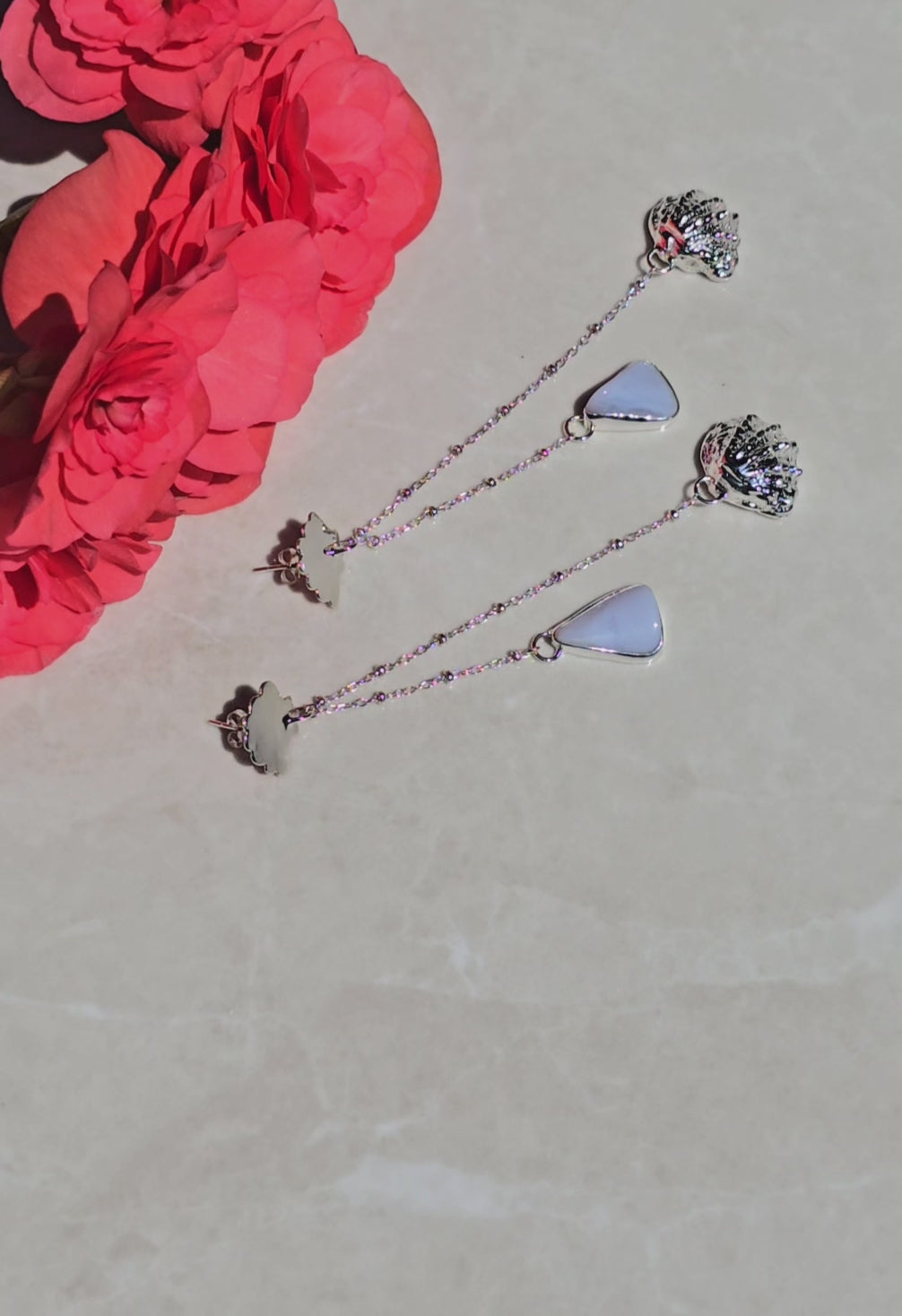 Inspired by ocean treasures, these earrings celebrate the quiet strength and beauty found by the shore. The seashell represents protection and intuition, while blue lace agate offers tranquility and gentle communication. Together, they create a wearable reminder to speak softly, walk gently, and listen deeply.