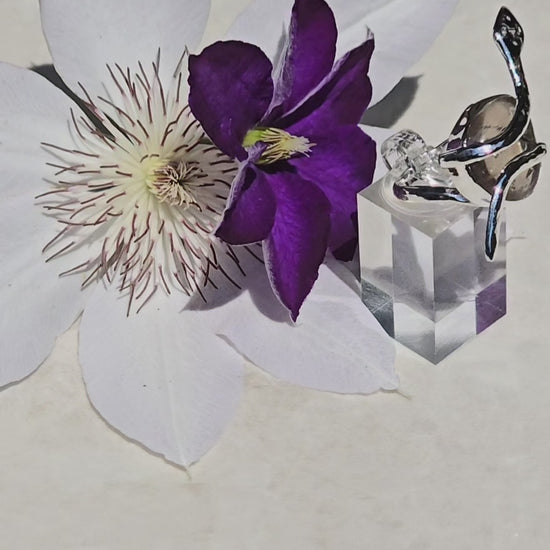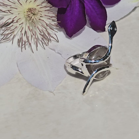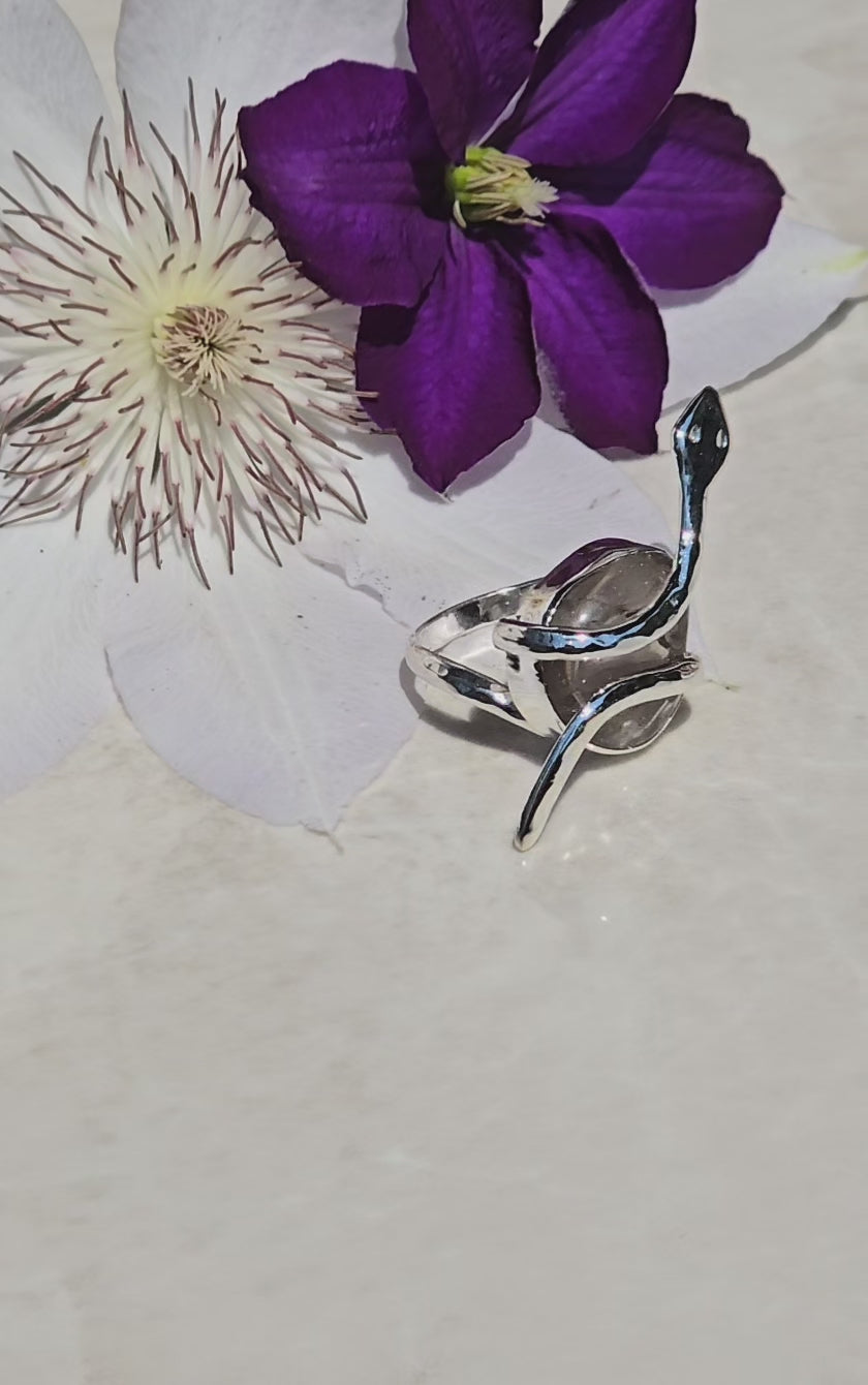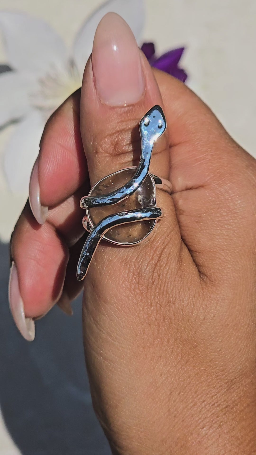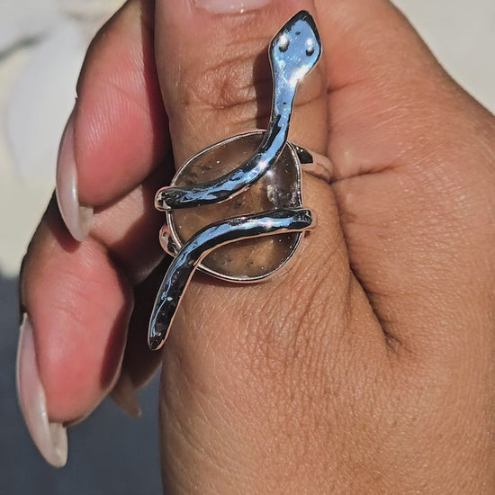 Crafted in solid .925 sterling silver, this one-of-a-kind ring features a hammered S-shaped band that mimics the fluid motion of a snake. A coiled serpent wraps around the bezel-set smoky quartz, its tail curving downward and head rising up the finger. The design is rich in texture and movement, giving the piece a dynamic, almost living presence.