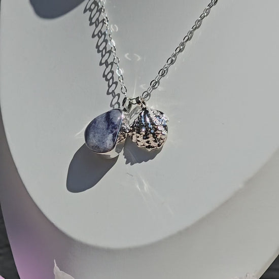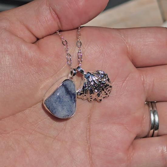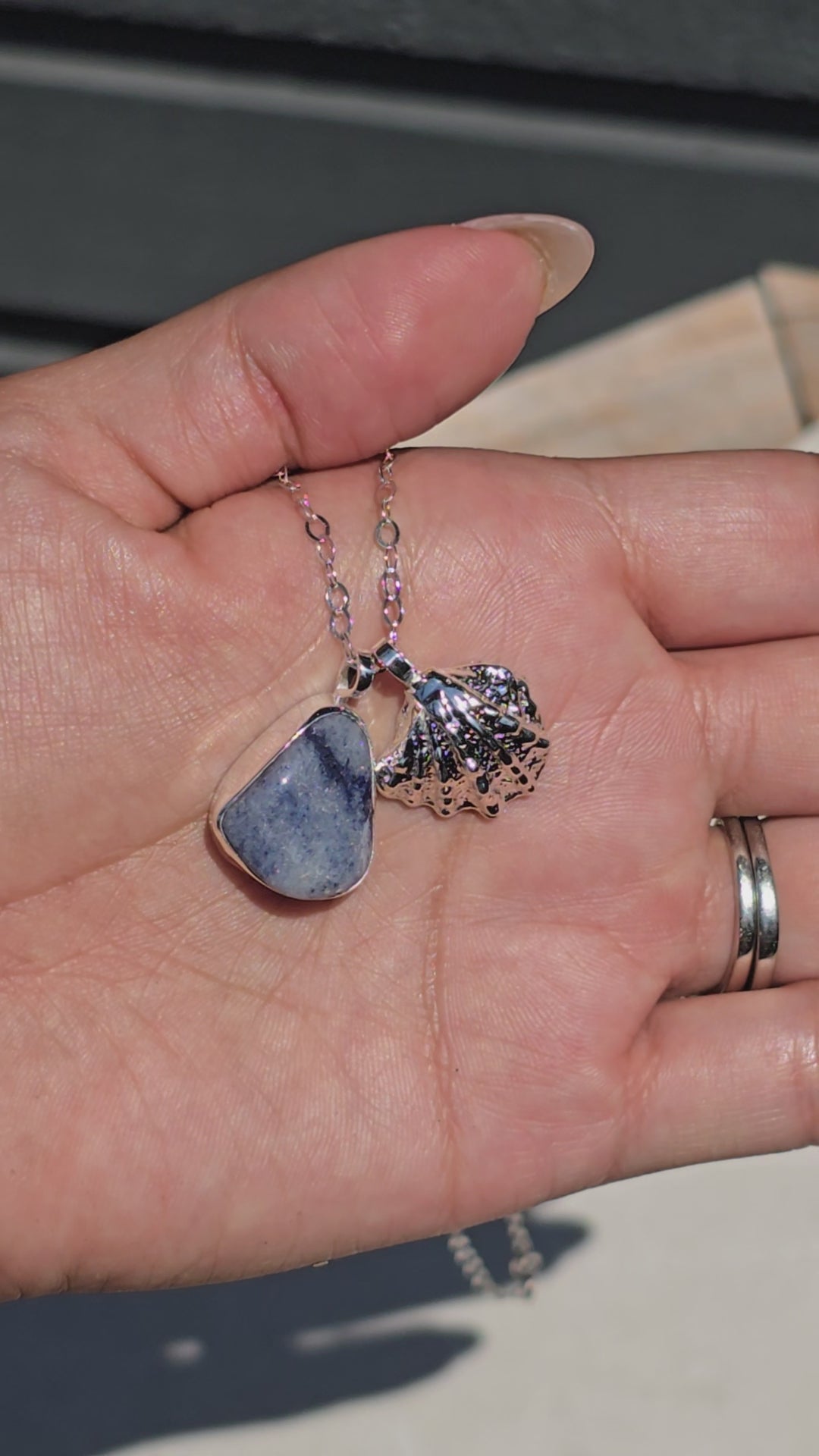 This handmade sterling silver necklace features a double-charm design: a sandcasted seashell, rich in organic texture and cast from a real shell found by the sea, and a deep blue dumortierite stone bezel-set in sterling silver. The dumortierite is open-backed, allowing light to pass through and highlight its natural marbling and subtle shifts in color.