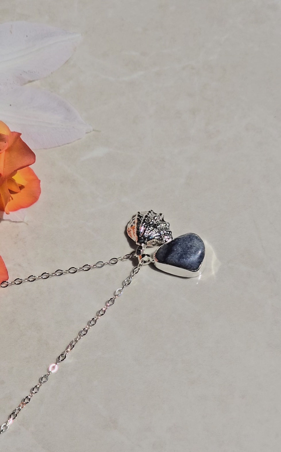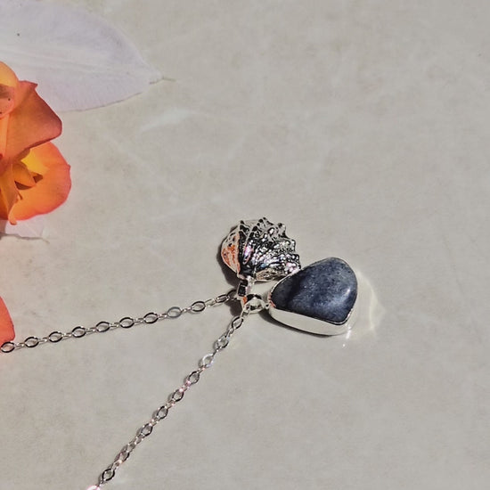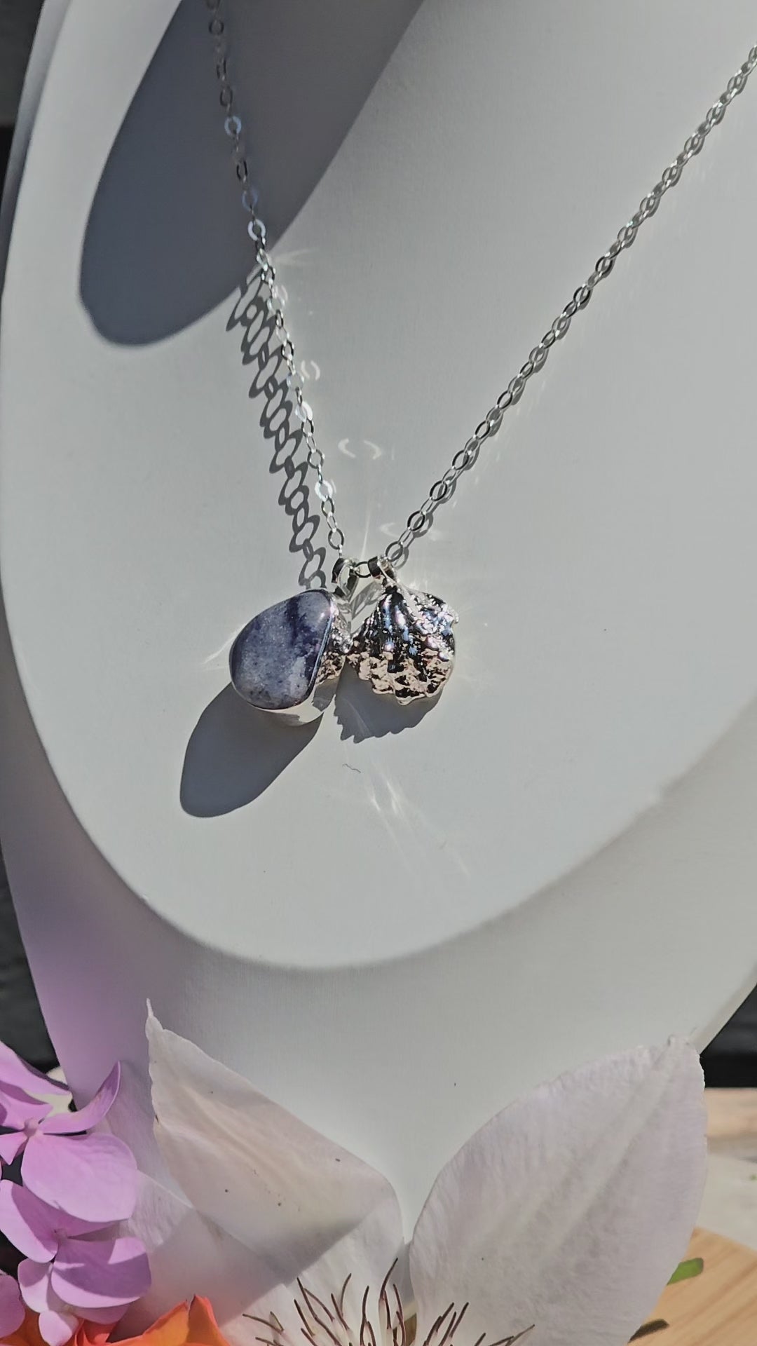 This necklace brings together the strength and serenity of the sea. The sandcasted shell symbolizes intuition, emotional flow, and the quiet treasures of nature, while the dumortierite stone brings a sense of mental clarity and gentle inner guidance. Together, they offer a grounding reminder to stay connected to both your inner tide and the natural world around you.