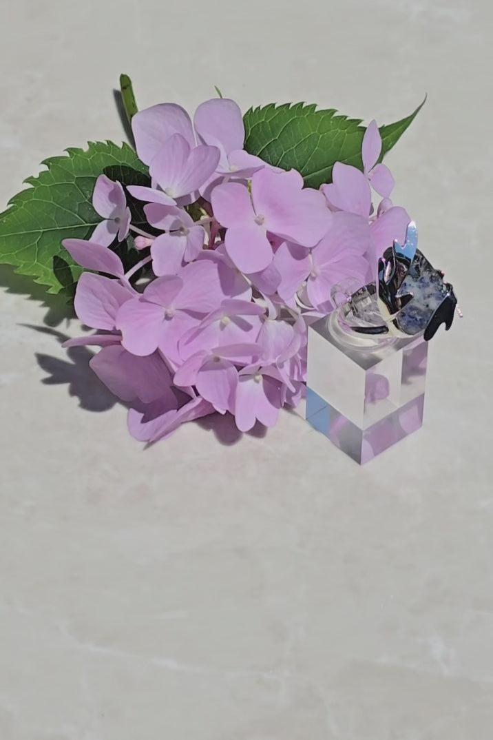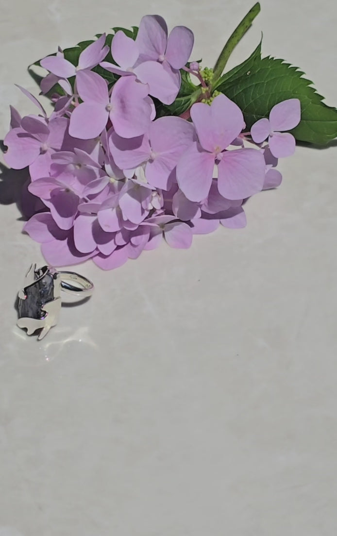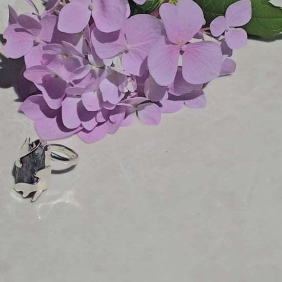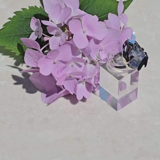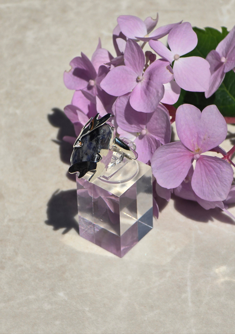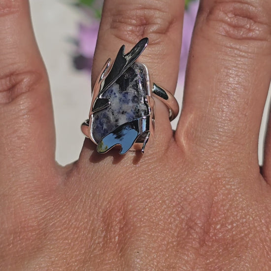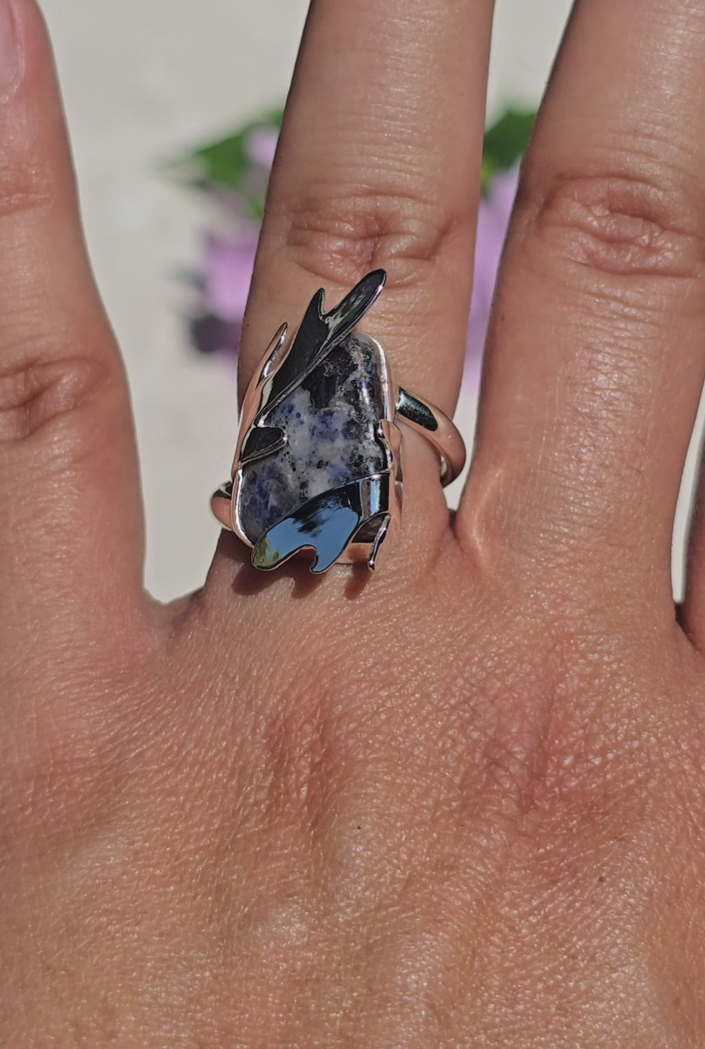 This ring highlights a unique natural sodalite stone marbled with silvery-dark hematite inclusions. Deep blue tones blend with snowy white veining, while shimmering streaks of metallic hematite give the piece an earthy, grounded sparkle. Each stone with this combination is extremely rare, making this ring truly one-of-a-kind.