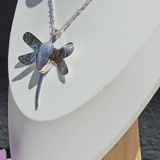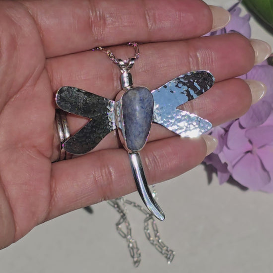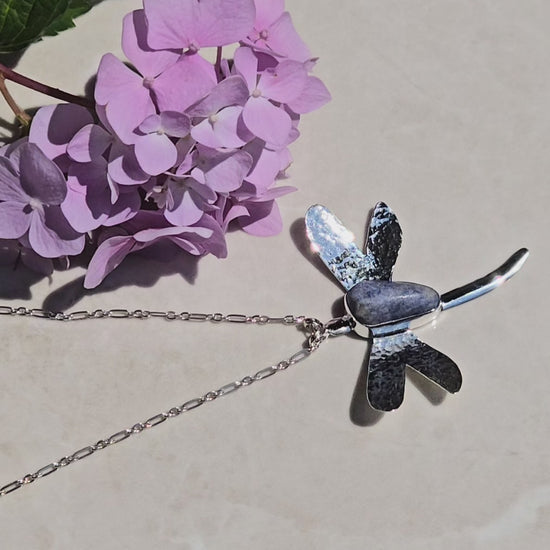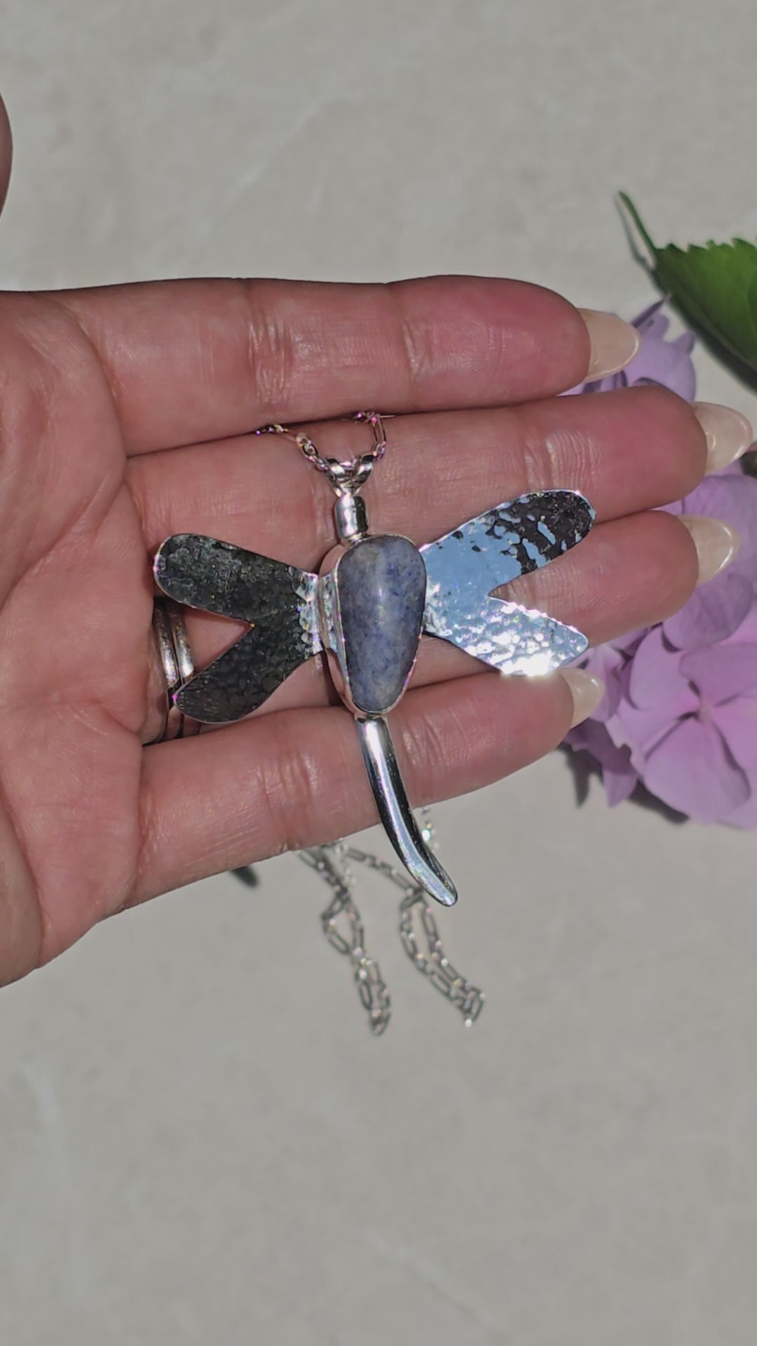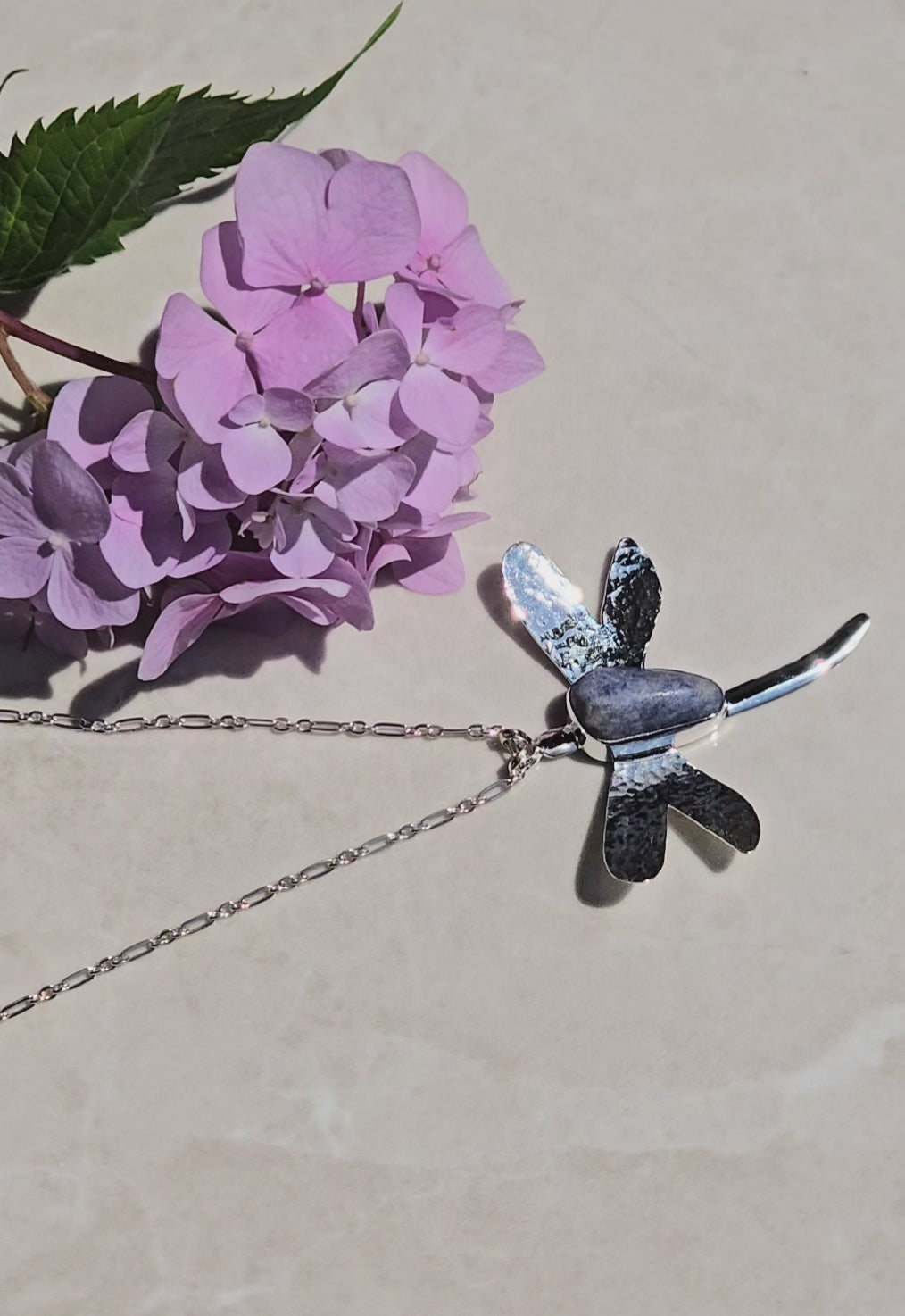 Light and strength take flight in this handcrafted sterling silver necklace, featuring a graceful dragonfly design with a deep blue Dumortierite stone as its center. A symbol of transformation and clarity, this piece is both meaningful and captivating—perfect for those drawn to freedom, growth, and nature's quiet wisdom.