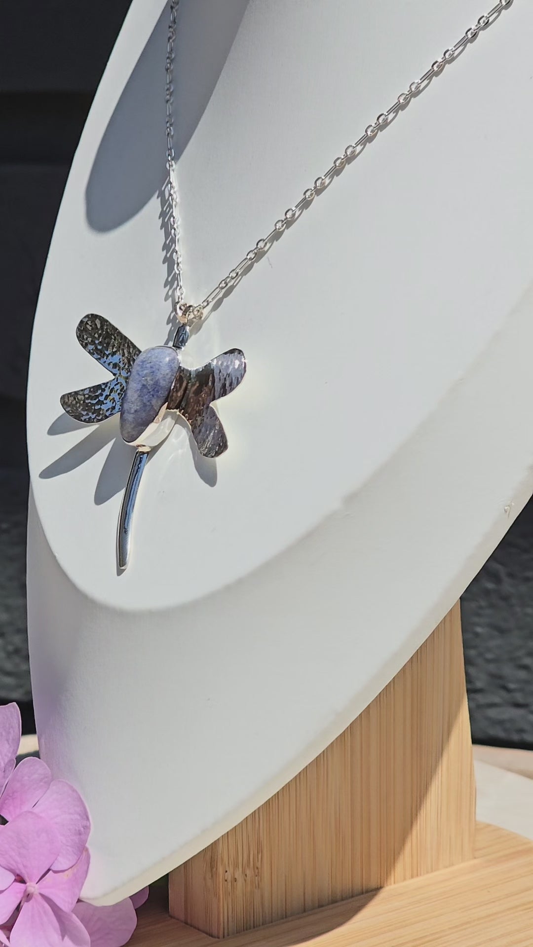 Meticulously handcrafted in sterling silver, this pendant showcases a dragonfly in mid-flight, with clean, airy wing shapes and delicate detailing. At the heart of the design is a polished Dumortierite stone, forming the body of the dragonfly. The piece hangs from a classic sterling silver chain with a subtle chain-link design that complements the flowing form of the pendant.